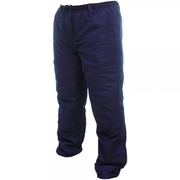 Calça de segurança, modelo com elástico e cordão para ajuste, confeccionada em poliéster, com 08 camadas de fibras internas de proteção em poliéster posicionadas no ângulo de 360º em torno da perna do usuário, desde a cintura ao tornozelo, forro interno em poliéster e algodão.