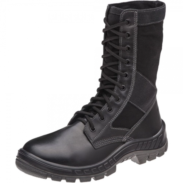 Coturno de segurança com proteção elétrica e mecânica, confeccionado em couro e cordura balística.