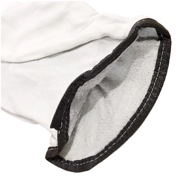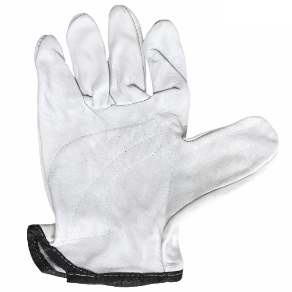 Reforço no polegar com tira em vaqueta natural e reforço entre costura dos dedos na palma, acabamento em viés preto.