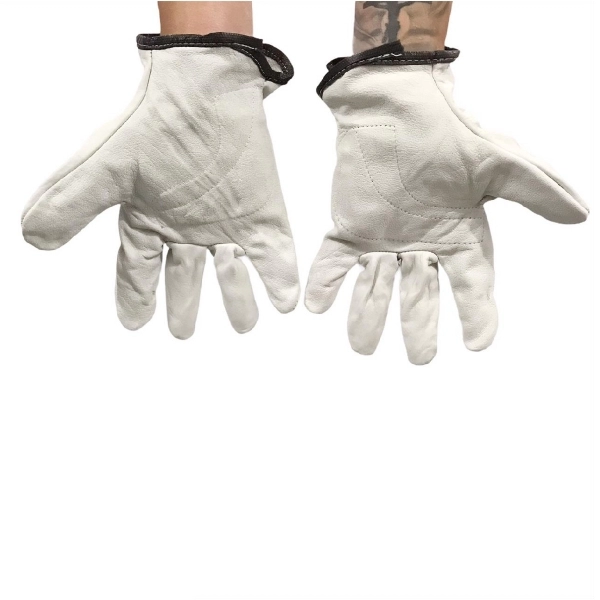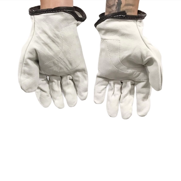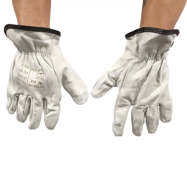 Luva para segurança com cinco dedos, confeccionada em vaqueta natural, com reforço palmar interno em raspa e elástico embutido no dorso, costurada com linha de nylon.