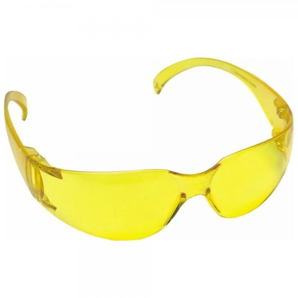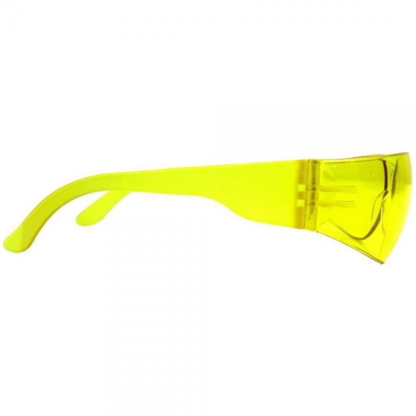 Óculos de segurança com armação e visor confeccionados em uma única peça de policarbonato amarela, com ponte e apoio nasal injetado na mesma peça e hastes tipo espátula. As hastes são confeccionadas do mesmo material da lente e articuladas nas extremidades do visor por meio de parafusos metálicos.