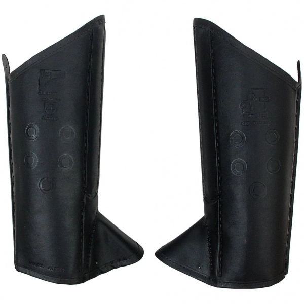 Perneira de segurança confeccionada em duas camadas de laminado de PVC, três talas de polipropileno na parte frontal, fechamento nas bordas por meio de viés em material sintético, fechamento em solda eletrônica.